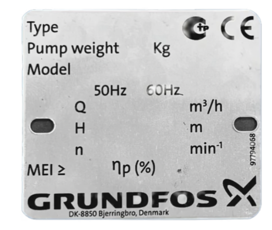 На оригинальных насосах Grundfos шильда (табличка с характеристиками) расположена на корпусе двигателя и содержит чётко выгравированные данные: