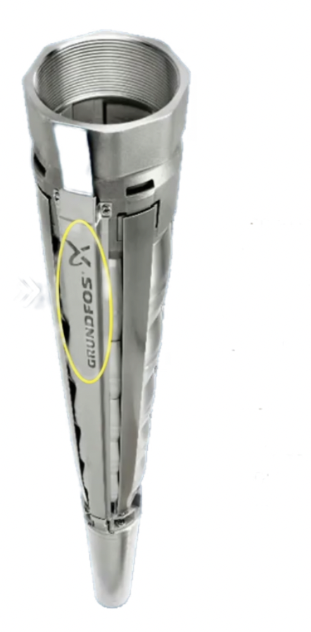 логотип Grundfos, нанесённый лазером, а не краской или наклейкой.